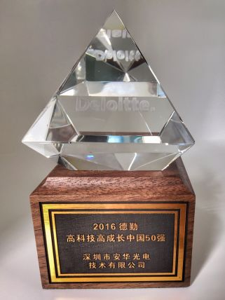2016年11月16日,2016德勤 “高科技高成長中國50強” 頒獎典禮在武漢舉行。安華光電以行業收入增速三年累計1494%,接近15倍的增長率排名亞太區第二十七,中國第十三,深圳第一。